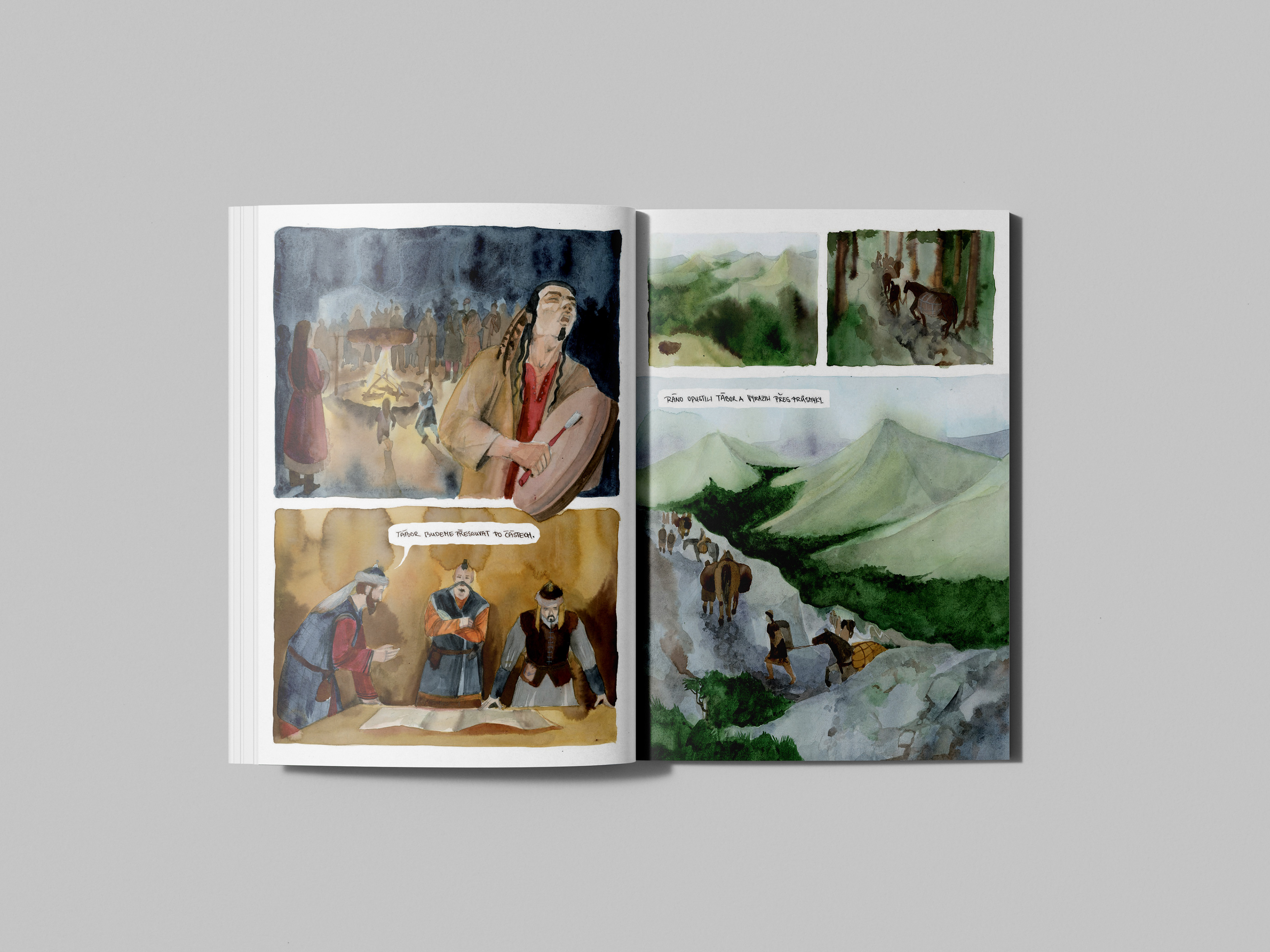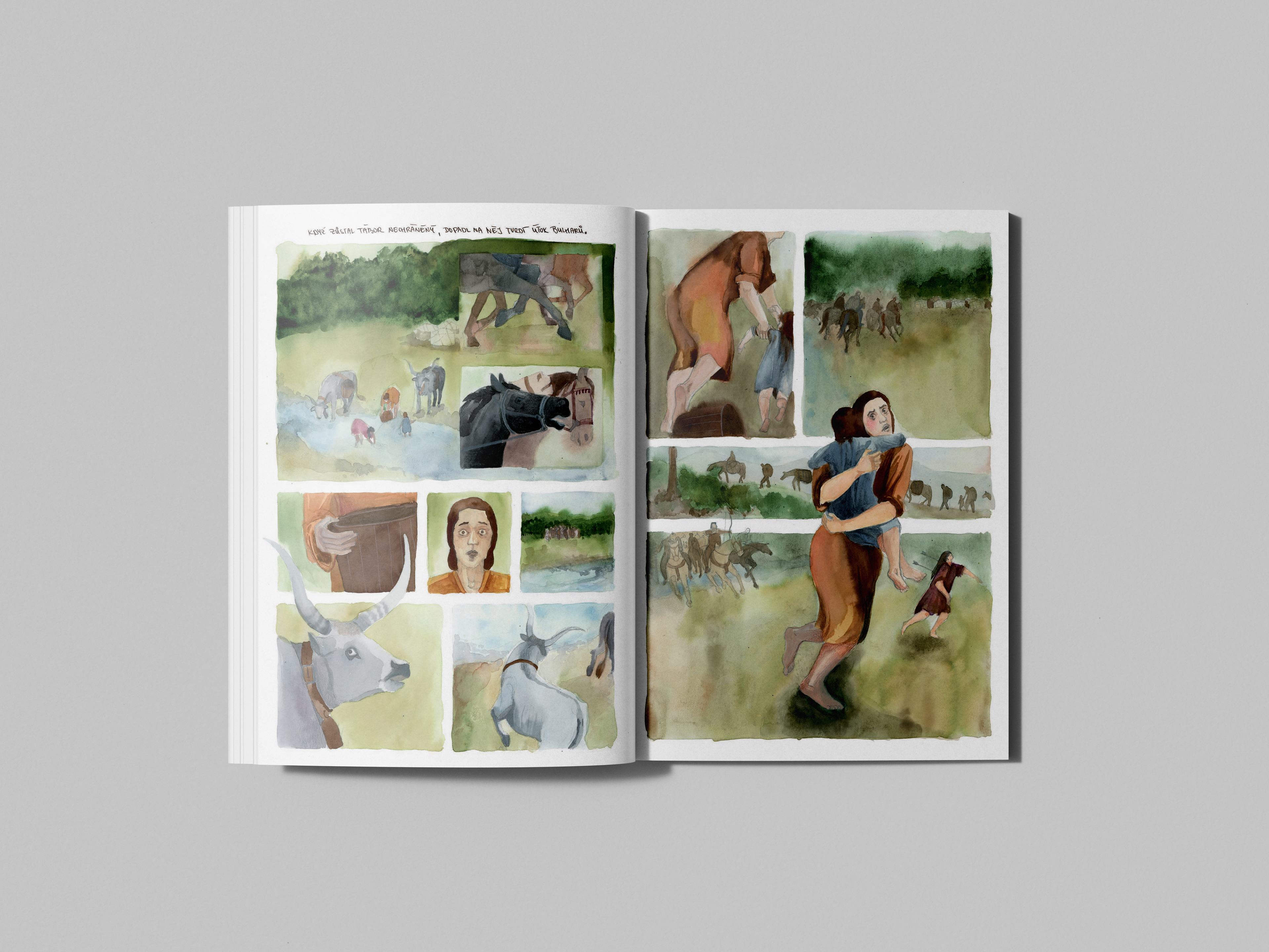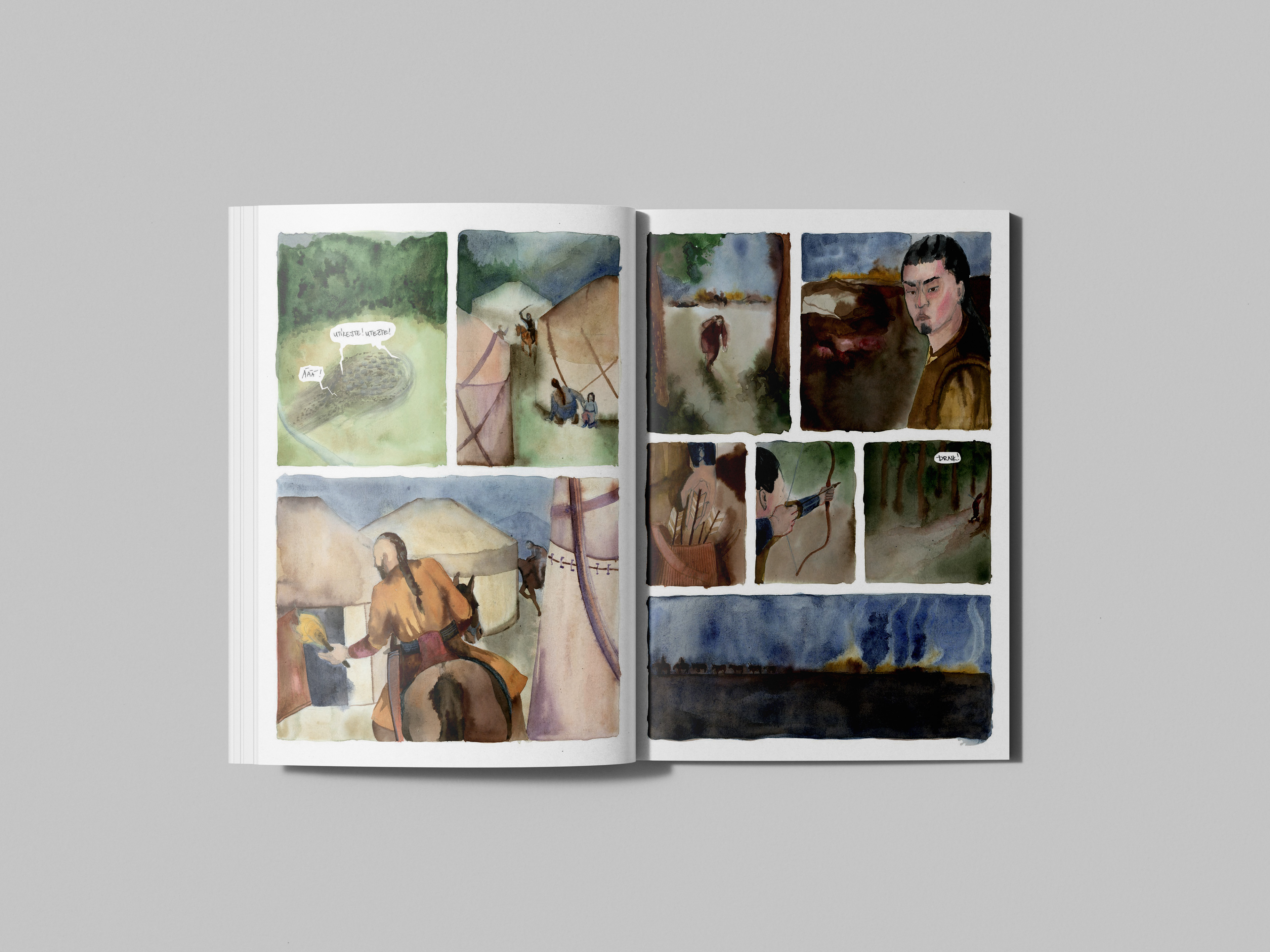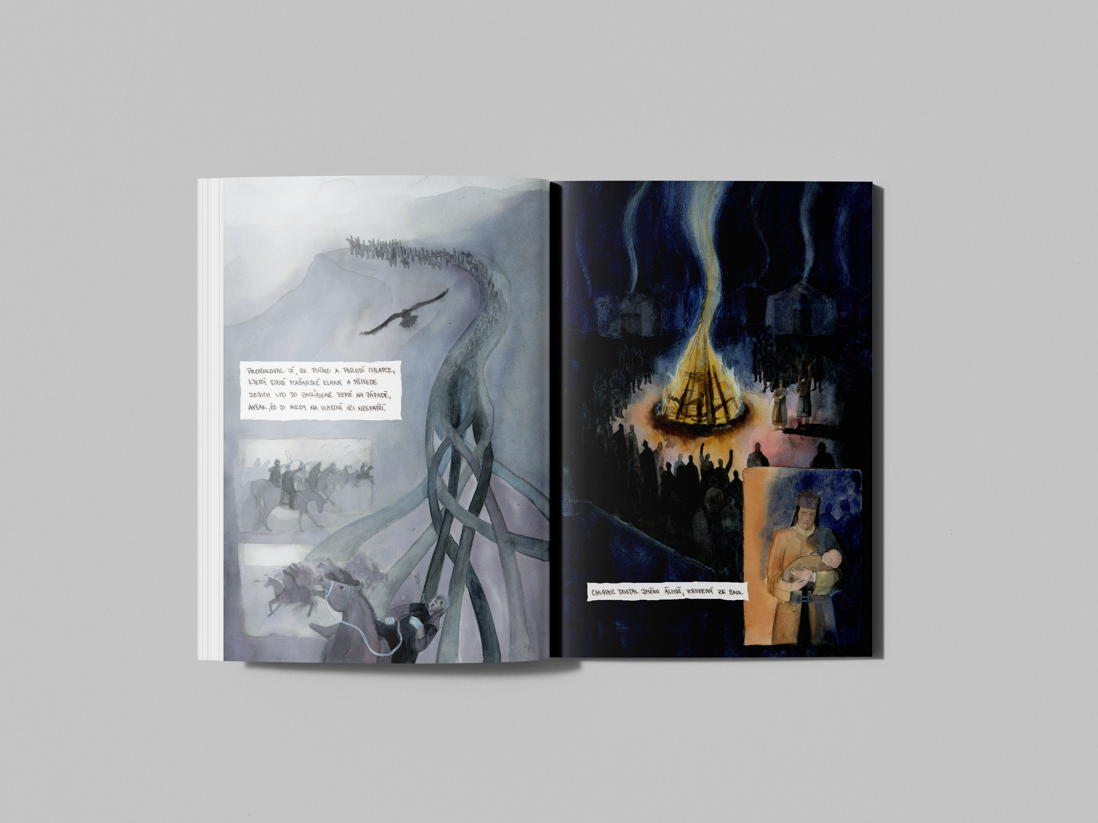 The Legend of the bird Turul tells the story of the arrival of Hungarian nomadic tribes to their present homeland. This selection of pages is part of a larger comic that highlights some key moments of their journey. In this case, watercolour has proven to be a perfect choice for those unclear and hazy moments that history does not specify, but imagination fills in.