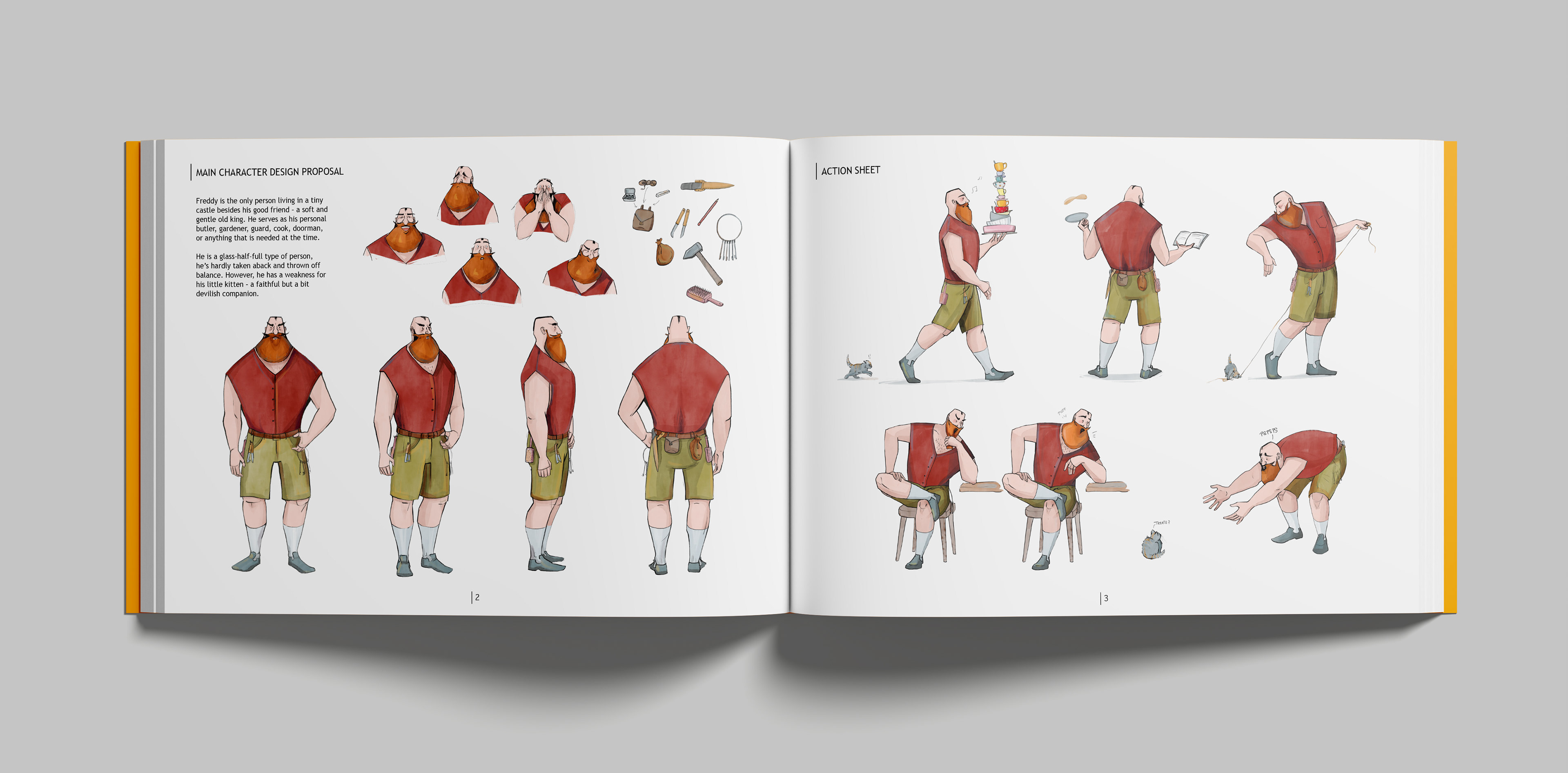 In this project, I focus only on a part of the characters the story features – one protagonist and one antagonist, and I developed action and character sheets for both. The character of Freddy the butler is inspired by a childhood story I used to beg my dad to tell as a kid. It’s a reimagined version of the story of how I remember it. Freddy is the perfect one-man army, guarding and caring for a castle with only his loyal, puffy kitten by his side. The character design follows principles of shape design, adding a touch of irony and surprise – a big, Viking-like figure who, in spite of his intimidating appearance, is actually a gentle and funny guy. The concept for this story was drawn digitally, however the desired outcome are watercolour illustrations.