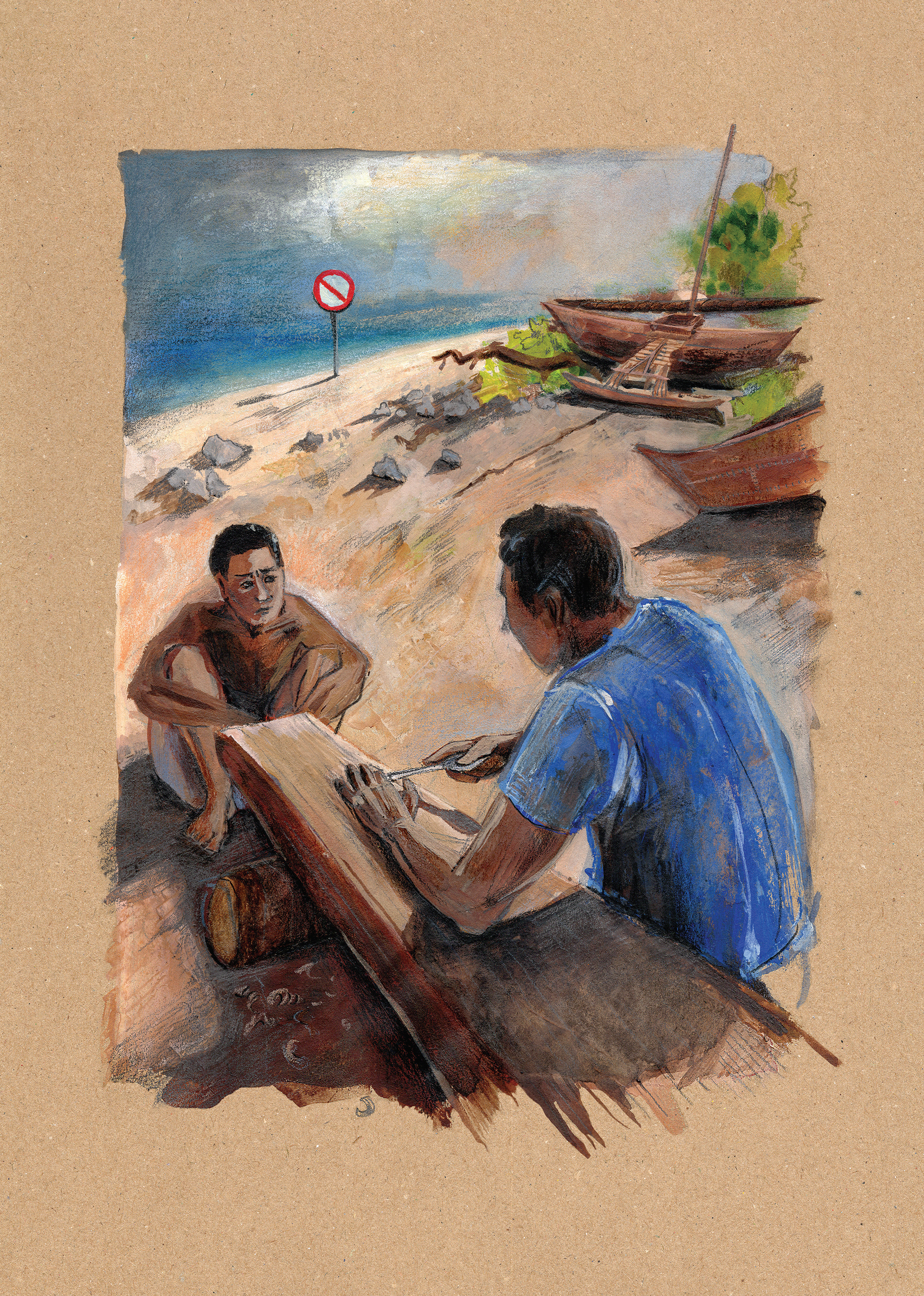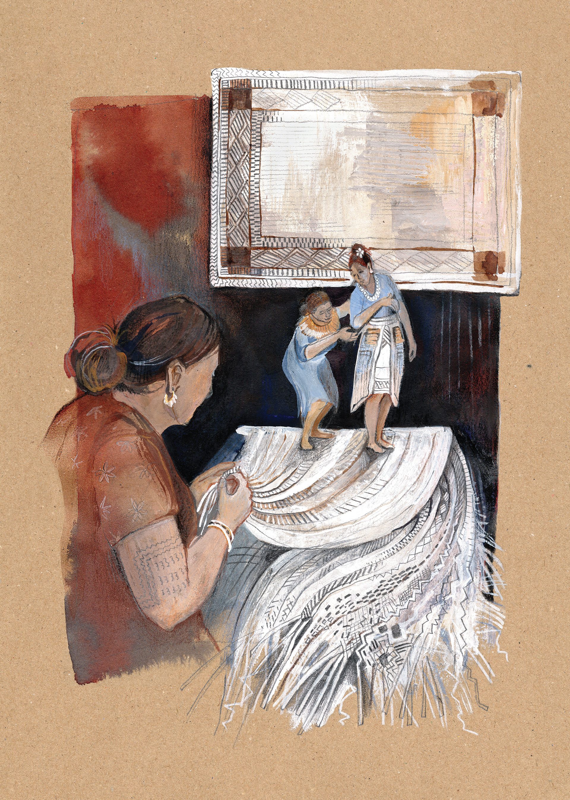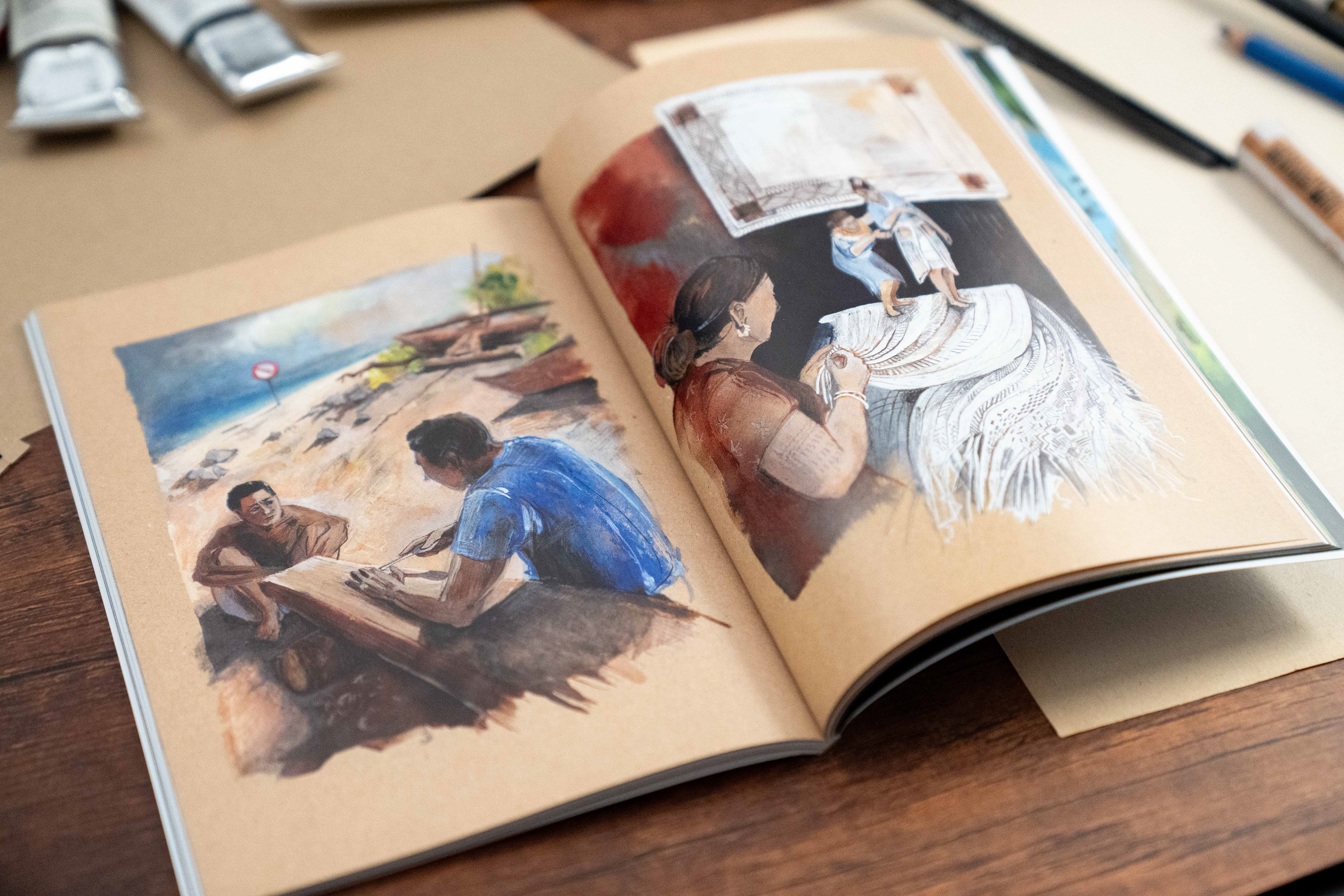 This series of illustrations was produced as a part of publication for an event "Im Schatten des Atompilzes" in summer 2025. I got deeply affected by the story of Marshal Islands'. The story of wiped out history, heritage, dying out language and folk tales as an aftermath of nuclear weapon testing is conveyed through 5 images. Each page, seemingly peaceful, represents an important pillar of the cultural heritage of people from the Marshal Islands – traditional dependence on coconut palm trees, tattooing rituals, boat building and sailing, legends and storytelling, and traditional weaving. However, by the effects of radiation, they are slowly decaying, dismorphing and disappearing as people forget.