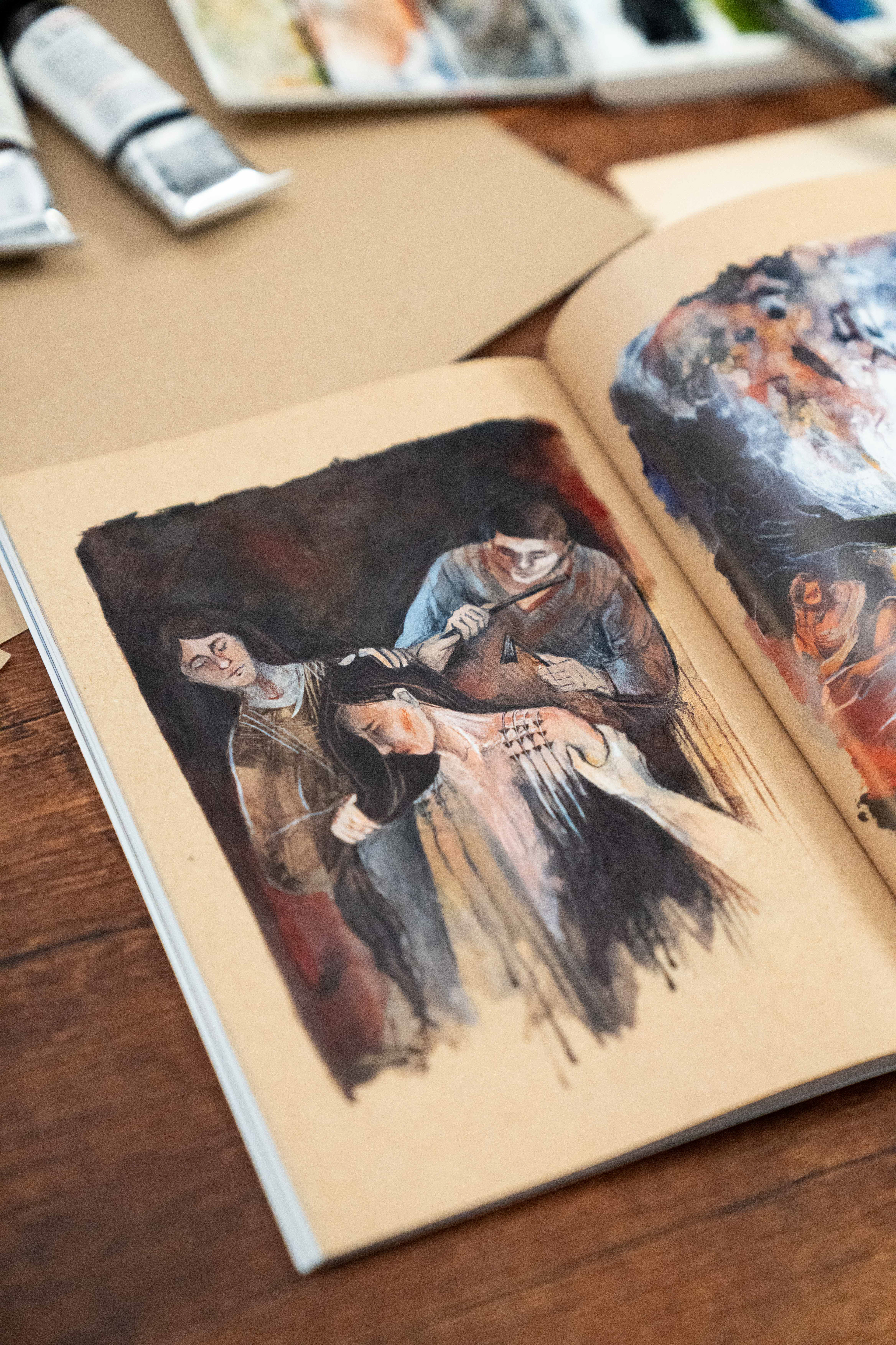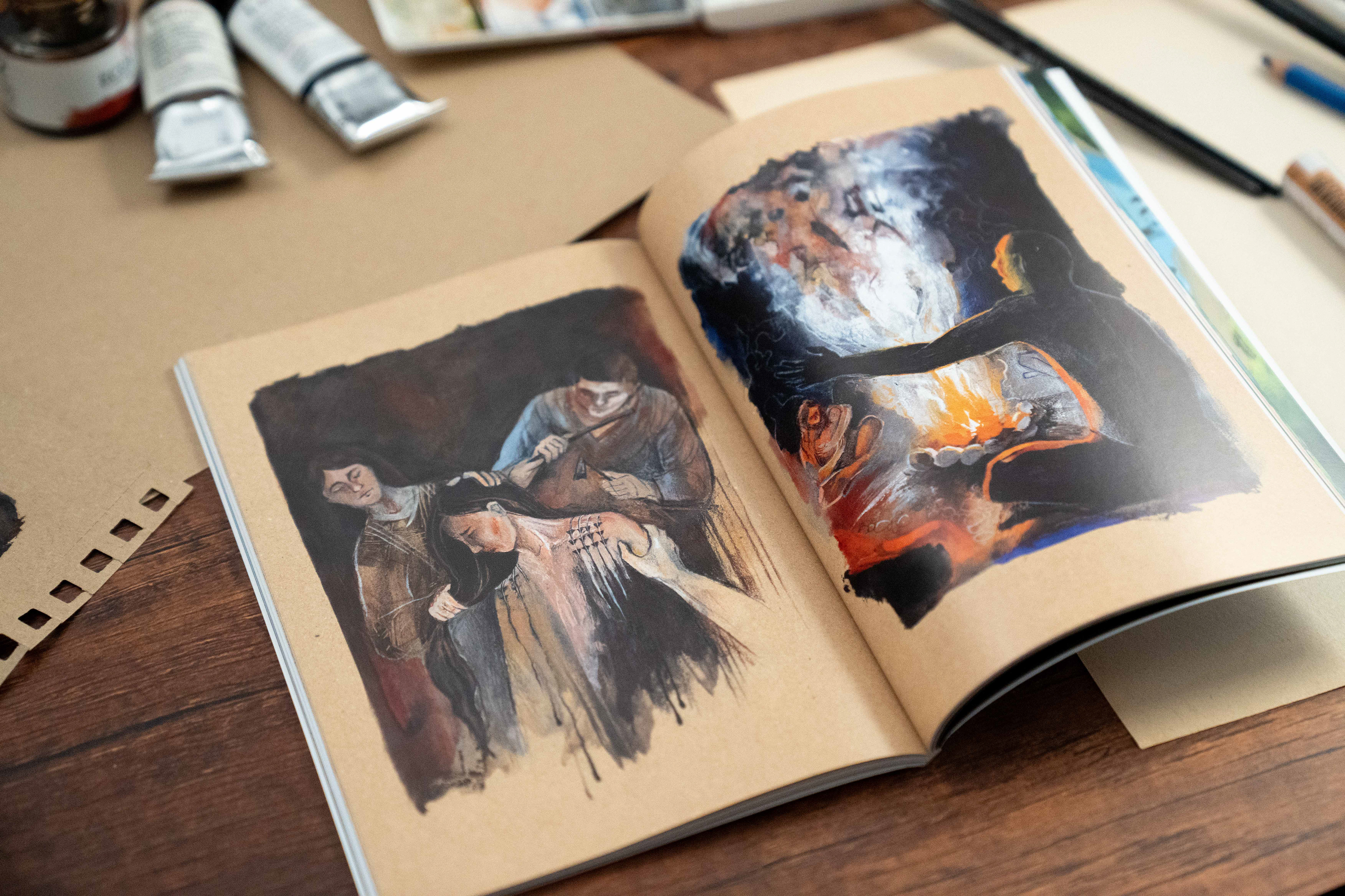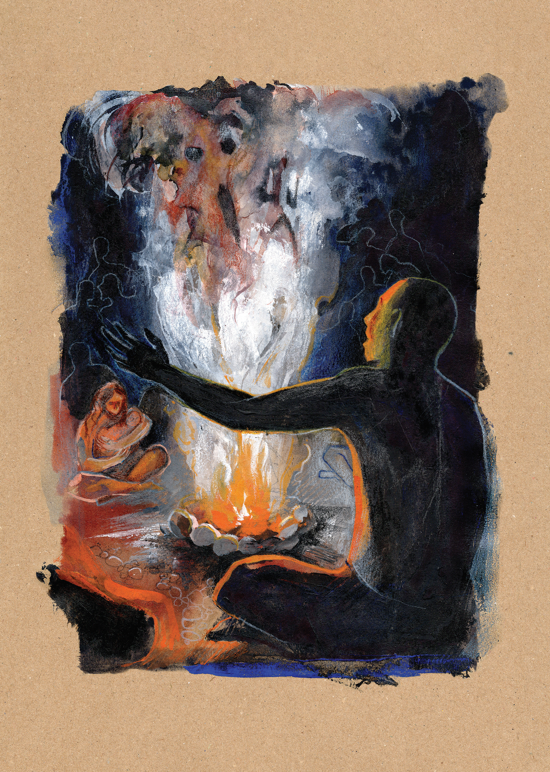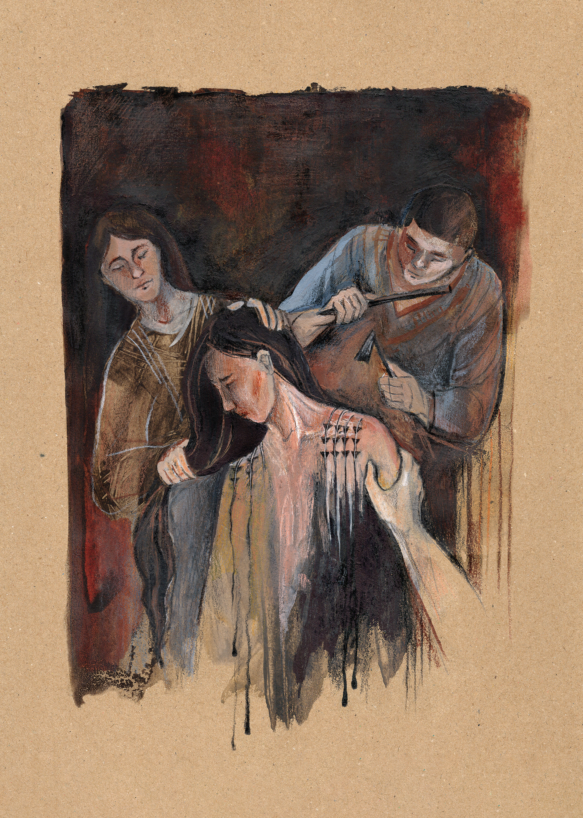 This series of illustrations was produced as a part of publication for an event "Im Schatten des Atompilzes" in summer 2025. I got deeply affected by the story of Marshal Islands'. The story of wiped out history, heritage, dying out language and folk tales as an aftermath of nuclear weapon testing is conveyed through 5 images. Each page, seemingly peaceful, represents an important pillar of the cultural heritage of people from the Marshal Islands – traditional dependence on coconut palm trees, tattooing rituals, boat building and sailing, legends and storytelling, and traditional weaving. However, by the effects of radiation, they are slowly decaying, dismorphing and disappearing as people forget.